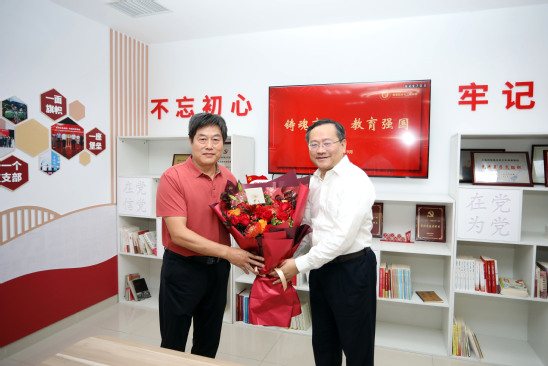 活动合影 暖心慰问传递祝福与敬意 正如学校第40个教师节庆祝大会指出的,近年来学校在高水平人才团队建设、学科交叉、创新人才培养等方面取得了一系列显著成绩,服务国家战略和区域经济社会发展的能级不断提升,学校综合竞争力日益增强,这其中每一项成就都离不开老师们的智慧与汗水。 为感谢老师们的默默耕耘和无私奉献,教师节来临之际,王凌宇、朱新远亲自带队,校领导分赴各学院、研究院看望慰问从教40年教师代表以及在教书育人、科技创新等各方面取得丰硕成果的优秀教师。校领导在慰问中对过去一年来老师们的辛勤付出表示感谢,并勉励大家深刻理解教育家精神的丰富内涵和实践要求,始终心怀“国之大者”,坚定理想信念,潜心教书育人,勇攀科技高峰,以昂扬的精神面貌和优异的工作业绩迎接学校第九次党代会的召开。