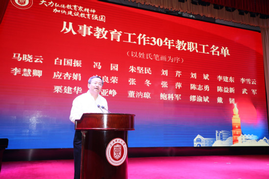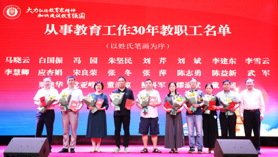 朱新远宣读从事教育工作30年教师名单并颁发荣誉证书