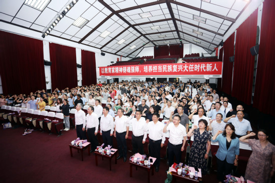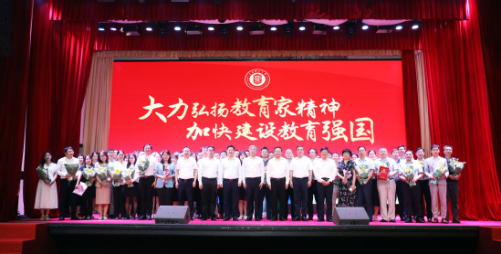 四十载春风化雨,四十载春华秋实。在第40个教师节来临之际,我校开展了系列庆祝活动,大力弘扬教育家精神,向全校广大教师和教育工作者致以热烈的节日祝福与敬意。 一场庆祝盛会让教师节仪式感拉满 9月10日下午,以“大力弘扬教育家精神,加快建设教育强国”为主题的上海理工大学第40个教师节庆祝大会暨新进教师入职仪式举行,校党委书记王凌宇,校长朱新远,党委副书记孙跃东,党委副书记、副校长盛春,党委副书记赵宁,副校长栗建华,副校长张华,中层干部、各单位工会负责人、30年教龄教师、获奖教师、新进教师、离退休教师代表等参加活动。健康科学与工程学院崔晚词、智能科技学院朱垌烨主持活动。