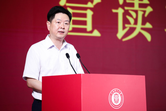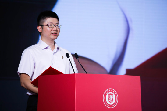 石悦言发言 管理学院教师赵靖作为教师代表发言。他以我校光电学院庄松林院士“追光”半个世纪的例子,鼓励同学们选择热爱,坚持热爱。他分享了管理学院校友穆振兴从上海理工大学毕业后创业的故事,激励新生们在学习中积极尝试,不畏挫折,勇于开拓创新。同时,他还强调了奋楫笃行、勇敢逐梦的重要性,希望以“强国有我”的气魄在大学中成长为卓越的人才。