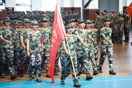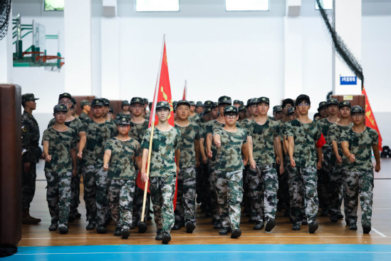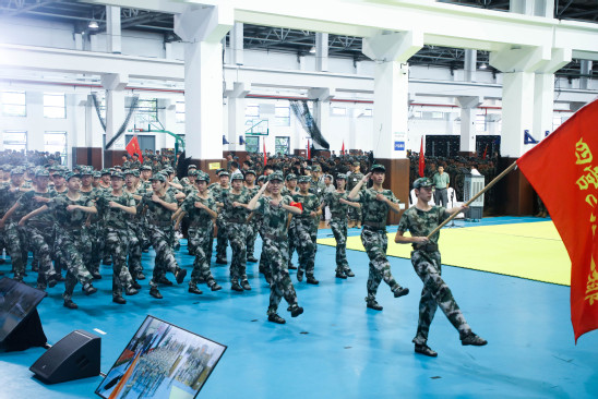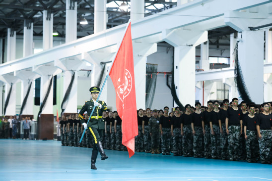 校旗队护卫校旗入场 随着教官一声令下,体育馆内2024级新生组成的方阵依次列队,呈分列式经过主席台接受检阅。他们的步伐坚定有力,口号嘹亮清晰,英姿飒爽,每一步都踏出了坚毅与青春的韵律。这不仅是13天军训成果的集中展示,更是新上理人“恰同学少年,风华正茂”的风采与“少年自有少年狂,心似骄阳万丈光”的朝气的生动体现。