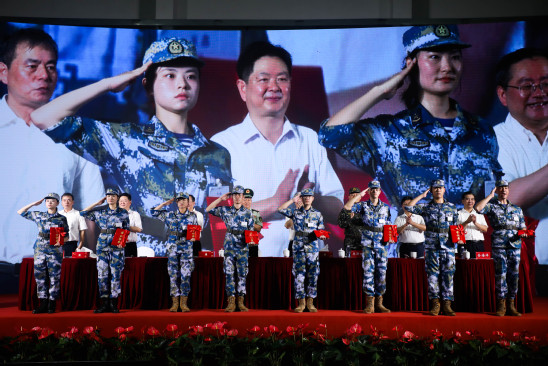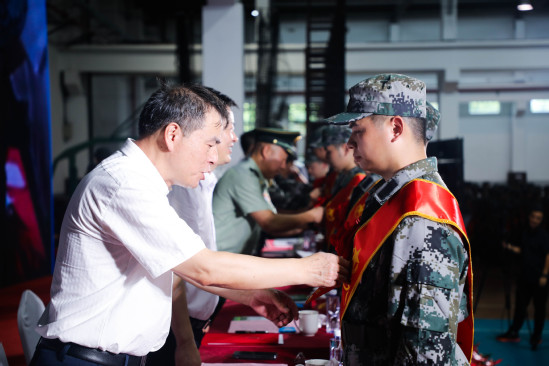 王凌宇向承训部队赠送纪念品 随后举行了2024年秋季入伍新兵欢送仪式。全体师生共同见证了上理有志青年的荣耀时刻。在热烈的掌声和庄严的音乐声中,新兵们依次上台接受校领导亲手佩戴的光荣花,象征着他们即将肩负起保卫国家和人民的神圣使命。未来,他们将带着学校的殷切期望和美好祝福,在新的征程中继续书写自己的辉煌篇章。