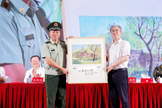 为优秀教官代表颁奖 王凌宇向承训的武警上海总队某部赠送由出版学院罗威老师指导的2024级新生陈鹿鸣的手绘作品《笔墨寄深情,军校共辉煌》。全体师生对长期以来鼎力支持和关心我校军训和国防教育工作的武警上海总队某部的全体官兵表示深深的谢意和崇高的敬意。