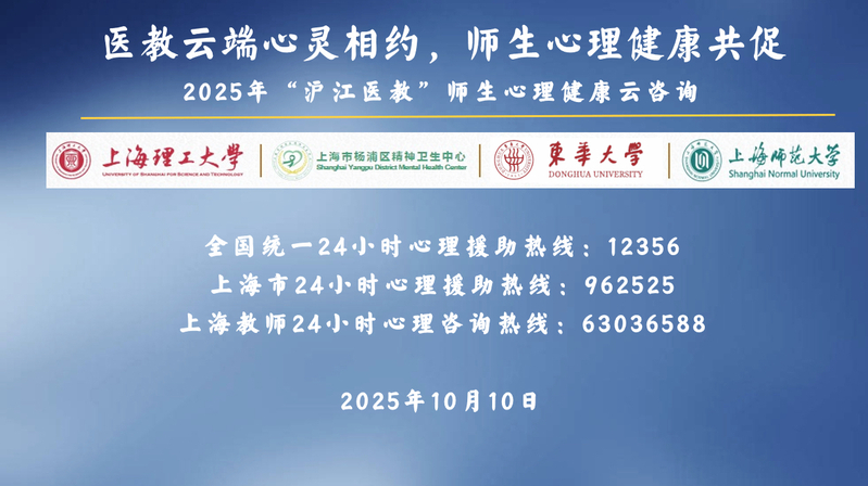 10月10日,在第34个世界精神卫生日来临之际,学校联合杨浦区精神卫生中心、东华大学、上海师范大学共同开展2025年“沪江医教”师生心理云咨询活动。 作为上海市教委“师生心理健康共促进”项目的重要内容以及我校心理工作沪江医教模式的延续与深化,本次活动紧扣今年“人人享有心理健康服务”的全国宣传主题,以专业高效的云端服务回应师生心理需求。咨询师团队汇聚跨校跨领域的专业力量,由我校及附属教育系统心理咨询师、东华大学与上海师范大学心理咨询师以及杨浦区精神卫生中心的心理治疗师、精神科医师共同组成,均具备系统培训背景与丰富个案经验,能精准对接师生在学业压力、职业规划、情绪调节等不同维度的心理诉求,实现“教育+医疗”横向互补,“大中小学段”纵向贯通,为服务质量筑牢根基。