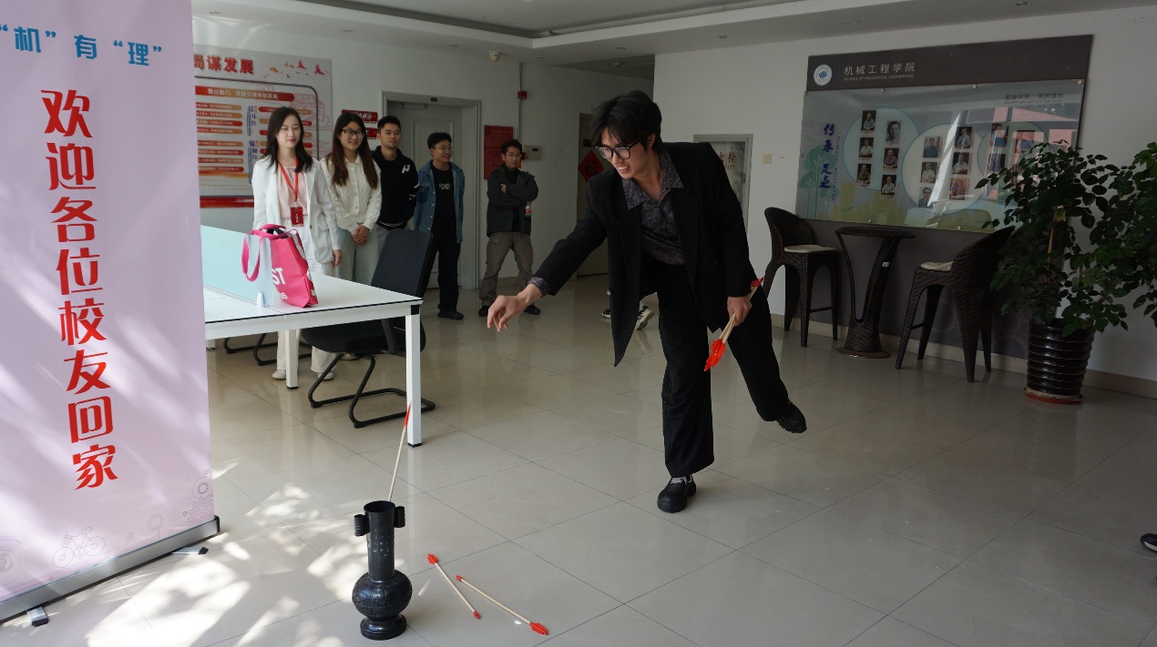 活动现场 欢聚·雅趣——嘉年华里的笑语欢声 活动的最后环节是欢乐嘉年华,设置了“投壶雅趣”与“掼蛋对决” 两项活动。在“投壶雅趣”区,校友们屏息凝神,一试身手,在古朴的游戏中体验传统文化的魅力,每一次投中都引来阵阵喝彩。