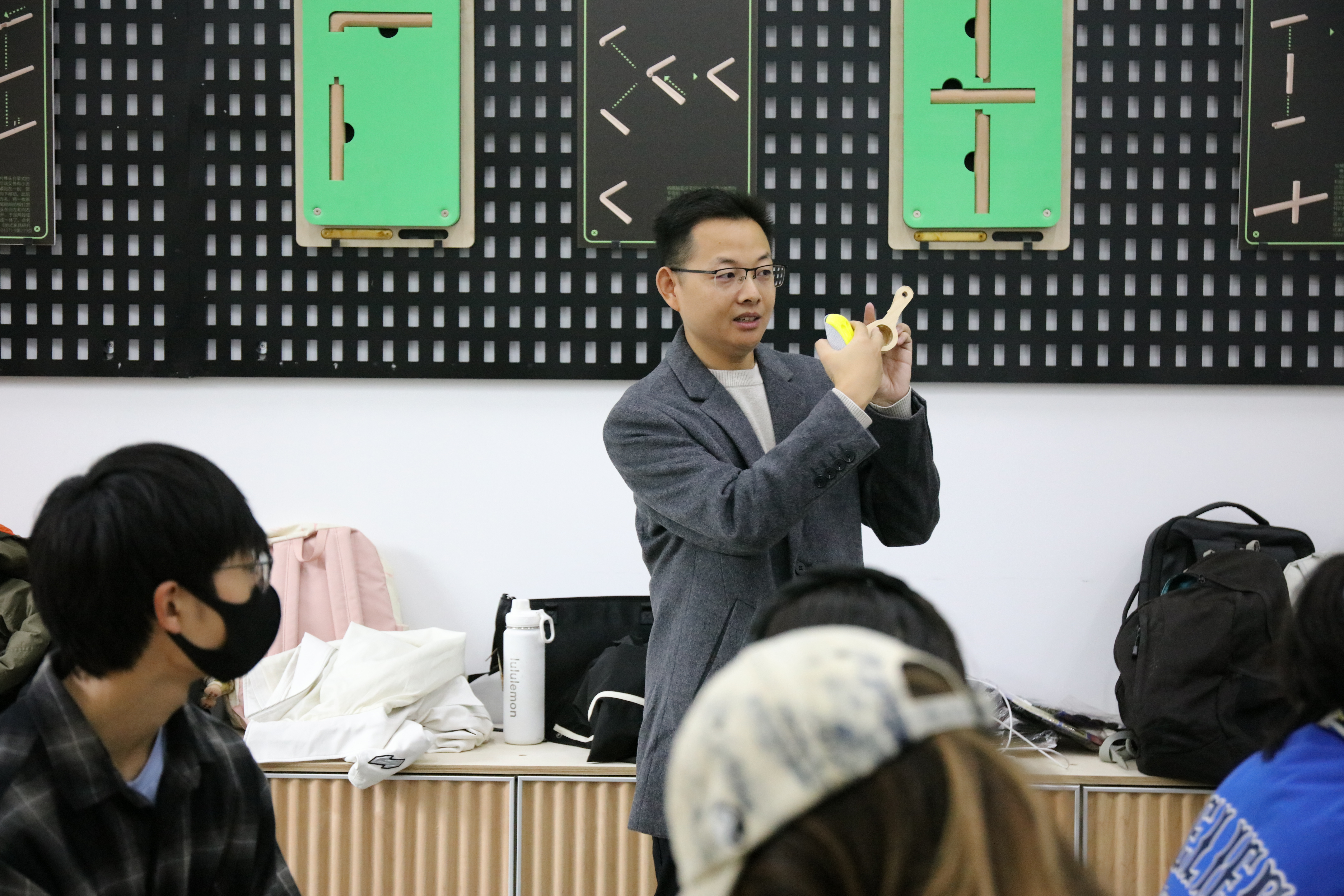 “光有想法还不够,想法必须接近实际,要能落地才行。”这一理念贯穿课程始终。在木工实践环节中,从工具使用、材料特性、加工工艺等基础知识学起,学生在实际动手打磨中不断地反思设计合理性,并进行实时优化。任课教师董冰洋表示,“学生要在砂纸与木头的反复摩擦中感知材料纹理、流线弧度,‘基础不牢,地动山摇’,这些看似基础的训练,正是未来驾驭复杂产品设计的基石。”