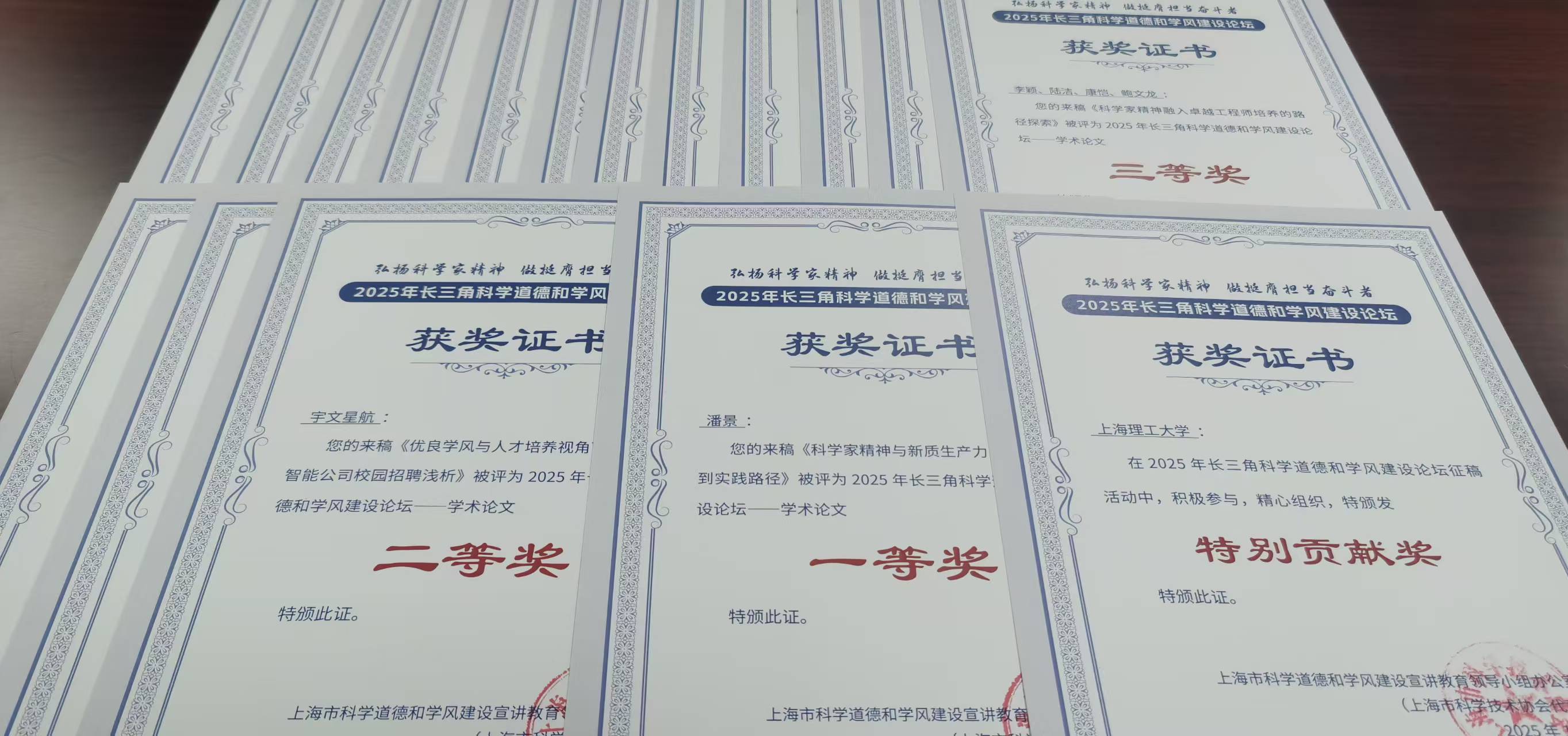 11月11日,在上海交通大学举办的“2025年长三角科学道德和学风建设论坛”上,上海理工大学再次荣获“特别贡献奖”,仅3个高校获此荣誉。来自全国30余所高校和科研院所的师生代表共同参与本次论坛,上海市科学技术协会、市教育委员会相关领导出席。我校研究生工作部副部长、研究生院副院长王张琦带队参加。