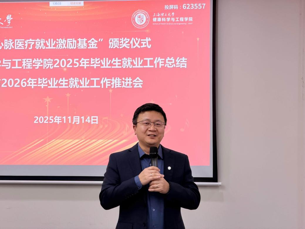 11月14日,上海理工大学“心脉医疗就业激励基金”颁奖仪式暨健康科学与工程学院2025届毕业生就业工作总结与2026届毕业生就业工作启动会,在上海微创心脉医疗科技(集团)股份有限公司总部圆满举行。这次会议既是一次总结会、表彰会,更是一次动员会、推进会。健康学院党委书记姚秀雯、副书记李陈财、副院长崔海坡,各系主任、专业负责人、获奖教师代表、毕业班辅导员;以及心脉医疗董事、总裁朱清,心脉医疗品质、注册与临床资深总监、党支部书记冯晓钰,人力资本与行业高级总监张国盈,事务部总监奚菊红等企业代表等,齐聚一堂,共话人才培养与校企合作。会议由李陈财主持。 会上,李陈财通报学院2025届毕业生就业落实情况和2026届毕业生就业意向等基本情况,分析了当前就业形势。他强调要继续做好2025届未就业学生的继续关心与帮扶工作,有针对性的做好2026届毕业生的就业引导、充分发挥就业育人功能;要做细做实“一生一策”,构建系主任、专业负责人、导师、班主任、辅导员等多方协同格局;要深化“访企拓岗”行动,拓宽就业渠道与质量。他还介绍了“心脉医疗就业激励基金”情况,宣读了2025年心脉医疗就业激励基金获奖名单。