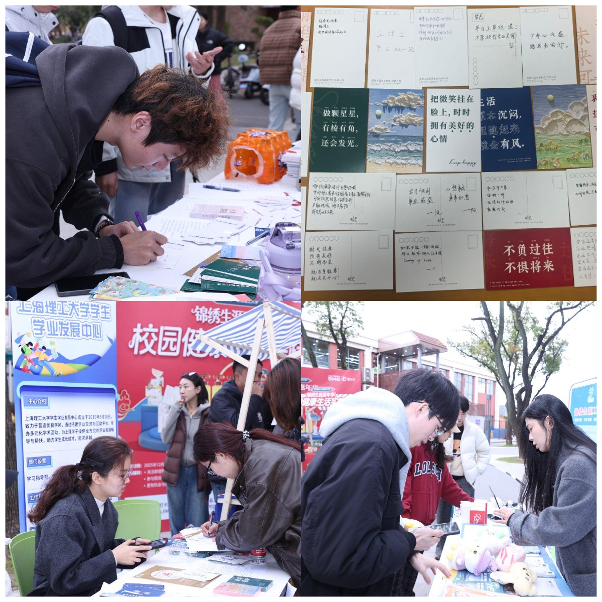 多元“社区摊位”一站式服务,构建成长支持网络 活动现场模拟社区服务形态,设立了多个开放式互动“摊位”,构建了一个集探索、生活与情绪支持于一体的临时“成长社区”。校学业发展中心的摊位贴心提供了各类实用学习资料与生涯规划工具,同学们可自由取阅,获取即时的学习与生涯发展支持。海鸥计划—尚理湾设立的“未来加油栈”则格外温馨,鼓励同学们亲手书写祝福明信片,或为奋斗中的自己寄语打气,或为同伴送上暖心鼓励,情绪价值满满。锦绣生涯工作室还将企业赞助的洗发水、液体香皂等发放给参与的师生,提供生活便利。大家在轻松自然的社区氛围中,不仅探索了职业可能性,更亲身感受到了来自学校、社会以及同伴的立体支持网络。