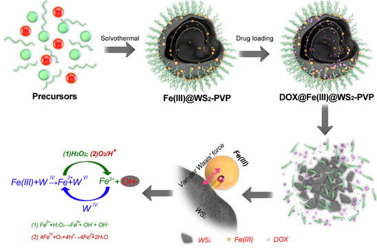 二维过渡金属硫化物纳米材料在生物组织内的安全性和降解性能一直是制约其临床转化的瓶颈。与中科院上海硅酸盐研究所和海军军医大学长海医院消化科合作,我校理学院王世革副教授报道了一种可降解WS2-Fe(III)复合材料的制备方法。研究发现,Fe(III)与WS2之间存在着内源性的氧化还原反应,而引WS2-Fe(III)的生物降解,生成可溶性的Fe(II)和WO42-。另外,降解产物中Fe(II)可以与肿瘤细胞内的H2O2产生芬顿反应,而产生具有细胞毒性的羟基自由基(·OH)。历经芬顿反应后,Fe(II)被氧化成Fe(III),并进一步与WS2反应,实现连续性的氧化还原反应和芬顿反应。这一氧化还原反应的反应速率与外缘的环境因子如肿瘤微环境等息息相关,同时还可以促进所负载药物分子的释放。该研究得到国家自然科学基金、上海市科委扬帆计划和上海市教委晨光计划的项目资助。