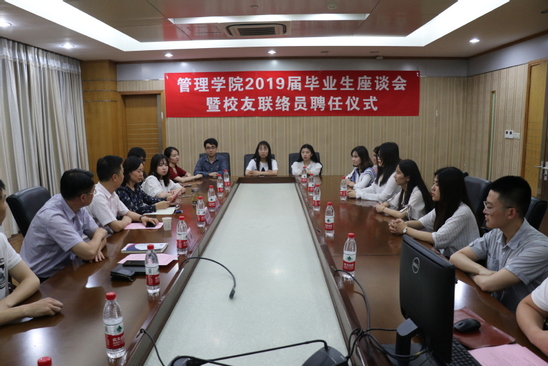 6月17日下午,管理学院在第二会议室召开2019届毕业生座谈会暨校友联络员聘任仪式,校友联络处处长孟宝全,管理学院副院长张峥、副书记姚秀雯出席,管理学院校友工作相关老师及2019届毕业生代表、校友联络员共同参加会议。