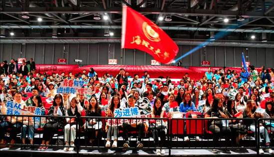 大会首发了由廖昌永,胡歌,黄豆豆,吴敏霞,朱正廷,黄龄,张军,邹市明,平安,吴睿睿等进博会青年志愿者宣传推广大使全新演绎的上海青年志愿者主题歌《年轻的力量》,充分展现了志愿者青春似火、青年担当,敬业奉献、奋进新时代的精神面貌。全体进博会志愿者庄严宣誓:“向前进,搏青春!”,上理小叶子们拳头紧握,声音铿锵有力,眼睛坚定有神,给人以昂扬的斗志和力量。最后,在少先队员的带领下,全体志愿者齐声唱响《歌唱祖国》,五星红旗随风飘扬,上理的旗帜和全场数十面校旗一齐舞动,全场气氛到达顶峰,每个小叶子都心潮澎湃,不断舞动自己手中的旗帜,以表达自己的热忱与激情。