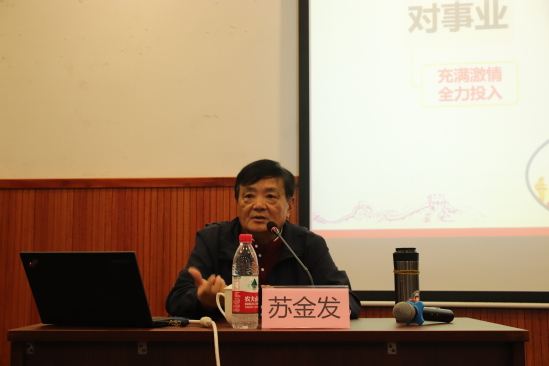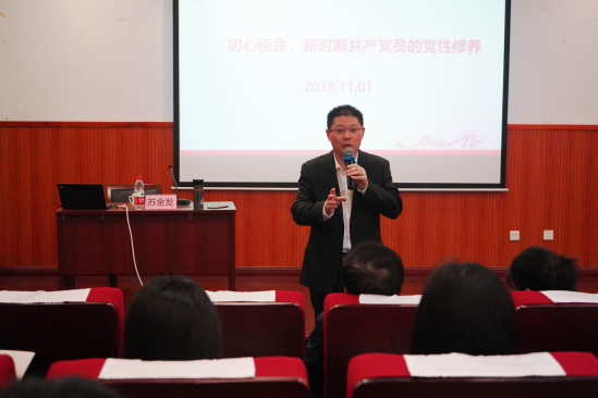 苏金发首先从“初心使命”的内涵入手,通过对《共产党宣言》的解读,指出中国共产党人的初心与使命,就是为中国人民谋幸福,为中华民族谋复兴,这是新时代共产党人强大的精神动力。并以雷锋、焦裕禄、阎肃等典型人物的先进事迹为例,展开对共产党员“党性”的深刻阐述。他指出,党性需从灵魂、原则、立场与态度四个方面进行考察,提升党性修养的有效方法是自重、自省、自警与自励。初心与使命是新时代共产党员的党性修养,而新时代共产党员的党性修养又是保持党的先进性的重要保证,是树立党的良好形象的固本之举。最后,苏金发向在场全体党员和入党积极分子提出了“入党为了什么、在党干些什么、为党留下什么”三个问题,发人深省。他建议大家不仅要把书读好、把身体锻炼好,还要时刻牢记自我角色,强化党员意识,做理想信念的坚定信仰者与模范实践者,因为政治进步永远在路上。