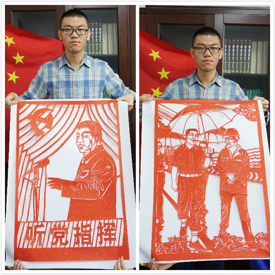 17级传播学3班周楠屿出生于非物质文化遗产——“卢龙剪纸”世家。他与“卢龙剪纸”第五代传人的母亲黄秀丽一起制作了以习近平总书记的形象为原型的剪纸组图。展现在习总书记领导下的中国共产党在祖国建设中所做出的巨大贡献,歌颂党与国家的繁荣兴盛。