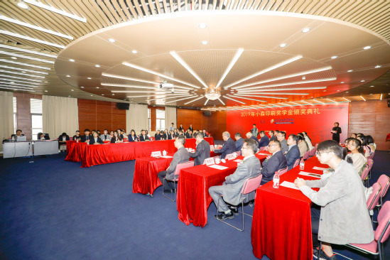 随后,2019年小森奖学金颁奖仪式在图文信息中心第一会议室举行。版艺学院党委书记吴建安详细介绍小森奖学金评选情况,今年共有20位优秀的同学获此殊荣。截止目前,累计已有240位同学获得过小森奖学金,部分获奖毕业生通过视频方式表达了感谢和祝福。校基金会办公室主任孟宝全代表学校接受小森株式会社2019年度捐赠支票。小森善治为2019年小森奖学金获得者颁发证书,并在每个学生的获奖证书上亲笔签上自己的名字,获奖学生在获得更大鼓励的同时,也收获了宝贵的记忆。为表达对小森株式会社的感谢,获奖学生代表杜嘉源献上了精心准备的中日双语歌曲《永远同在》。