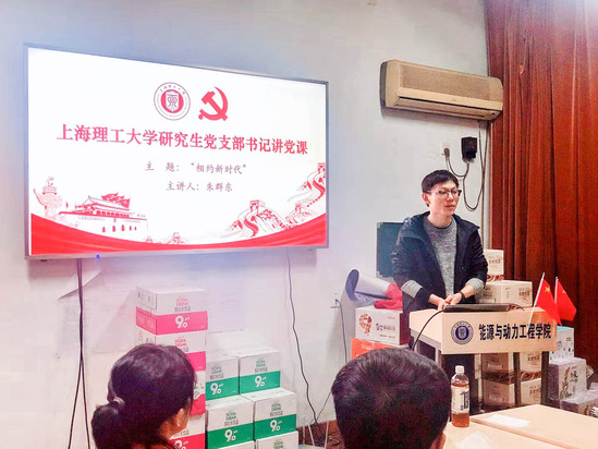能源与动力工程学院研究生党支部书记朱群东以《礼赞70周年——相约新时代》为主题,结合自身实际,在党课中谈道,相约新时代,作为新时代的青年人,应当学好自己的专业知识,将来结合自己的专业知识为祖国的建设贡献出自己的一份力量。