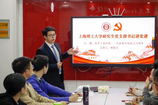 理学院研究生党支部书记逄博以《礼赞70周年--我和我的祖国》为主题,从电影《我和我的祖国》入题,通过国史发展脉络、经济发展历程、中国伟大成就等方面讲解,让党员深刻理解中华人民共和国从站起来到富起来再到强起来的历史进程,使青年党员更加坚定四个自信,与会学生纷纷表示要珍惜韶华,用青春去创造,努力做科技报国的践行者。