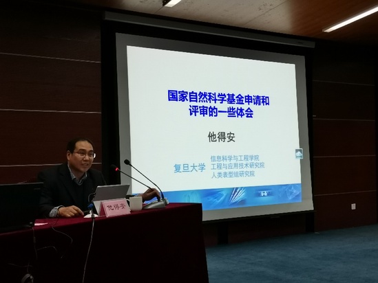 会上,学校邀请复旦大学信息科学与工程学院他得安教授以“国家自然科学基金申请和评审中的一些体会”为题做了精彩的报告。他得安教授从项目摘要的凝练、立项依据的撰写、研究内容的组织、创新点和关键科学问题的提炼、研究团队的组建等方面分享了自己以往在基金申请过程中的成功经验,也从评审专家的角度提出如何让申请书更容易引起专家的注意