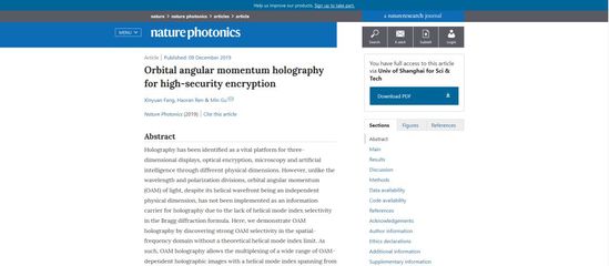 北京时间12月10日,相关研究成果以长文形式发表在世界光学顶尖期刊《自然-光子学》上。顾敏为该论文通讯作者,上理工光电信息与计算机工程学院特聘研究员方心远博士为第一作者。这是近年来中国科研人员在该刊发表的唯一一篇全息信息安全技术领域长文。