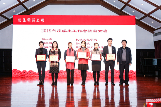 丁晓东为2019年度学院学生工作考核前六名——机械工程学院、管理学院、能源与动力工程学院、医疗器械与食品学院、材料科学与工程学院、环境与建筑学院颁发荣誉奖牌,勉励全体学工人在2020年勤勉不懈、砺行致远,愿大家奋进新时代、永当早行人!