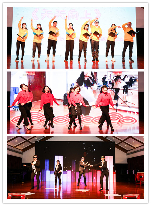 交流暨联欢会以“学思践悟”、“工贵求实”、“仁爱之心”、“致敬学工人”为主题分为四个篇章,彰显了新时代参与和支持学生工作的上理人所具有的饱满热情与昂扬面貌。在“学思践悟”篇章,歌舞《天天向上》用青春和活力传递正能量;《时光来电》融入青春元素,回顾年代金曲;《加班阵线联盟》则以诙谐幽默的表演形式,展现学工人平凡岗位上的不平凡。在“工贵求实”篇章,歌舞串烧《流金岁月》体现了学工队伍的团结拼搏与积极进取;抖肩舞《COINCIDENCE》融入学工人的日常工作,抖出了青春活力与无限创意;戏曲串烧《东南西北大拜年》则将西北民歌、通俗歌曲、豫剧、黄梅戏融为一体,呈现优秀传统文化特色。在“仁爱之心”篇章,一曲《我爱你,中国》唱出了学工人对祖国母亲的深情和对育人使命的担当;舞蹈串烧《舞动中英梦》传递了学工人舞动青春、坚守梦想的初心使命;合唱曲目《不忘初心》则将全场氛围引向高潮,不忘初心、继续前进的奋斗理念,激励全场学工人在新的一年再创佳绩。