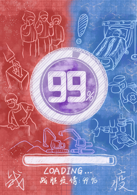 背景中的红色与蓝色代表着火神山和雷神山医院,红与蓝的碰撞有视觉冲击,体现出此次战“疫”的困难程度,以及大家必胜的决心。中间进度条的紫色则是红与蓝的结合,代表着结合了我们所有人的努力,一步一步向成功迈进。通过进度条加载的方式体现此次战“疫”的过程,医护人员、解放军、科研人员以及我们所有人,都在为此贡献力量。进度条加载到99%,代表着通过我们的努力,现在离胜利只有一步之遥。只要大家齐心协力,胜利就在眼前。