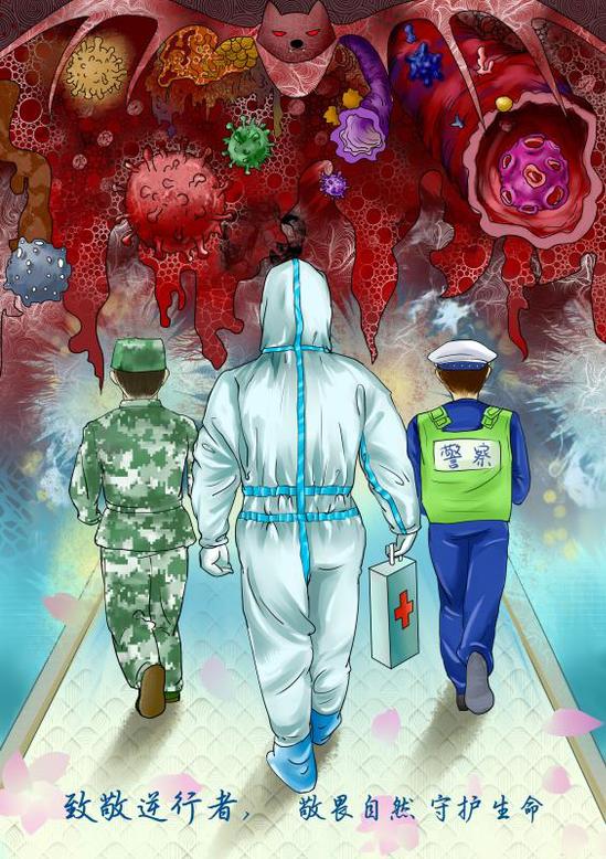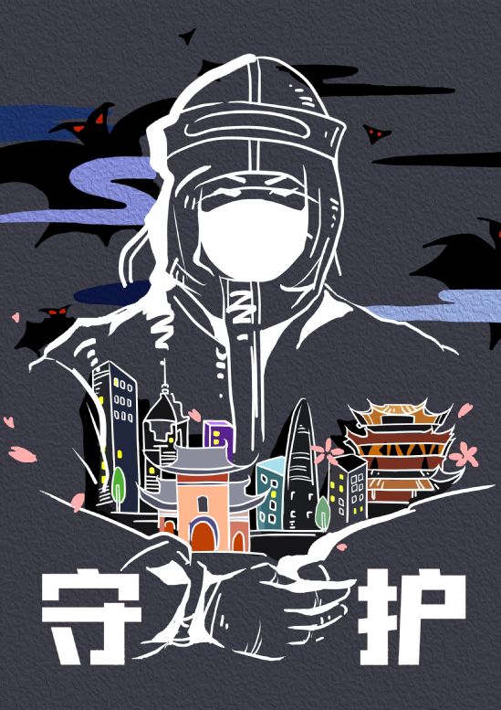 图中主体是一位医护人员,他用他自己的身躯抵挡了背后病毒的危险来守护怀中的城市。岁月静好的背后,总有人在为我们负重前行。因为有他们的守护,武汉、全国一定会打赢这场没有硝烟的战争。