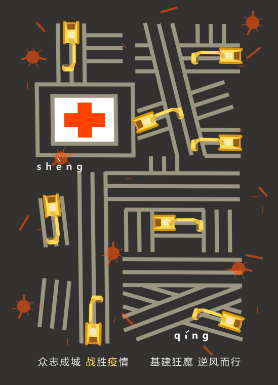 作品展现了基建队伍在这场战疫中的力量。灵感源于10天建成的火神山医院,挖掘机在土地上留下一道道与时间为敌的痕迹。挖掘机留下的痕迹形成战疫二字,表达了在这场战疫中,基建队逆行者奉献的巨大力量。战疫是战胜疫情的缩写,这场战疫终将胜利!