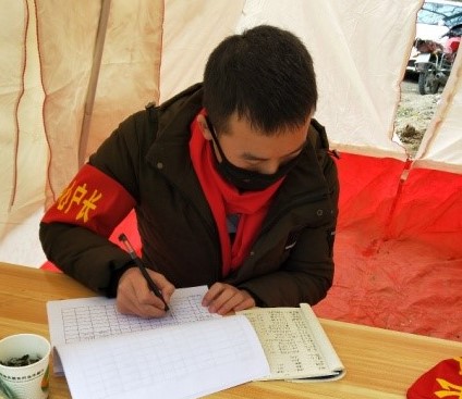 机械工程学院16级学生何许国充分发挥预备党员的模范带头作用,在返乡后参与了甘肃省陇南市西和县洛峪镇何胡村的封路路检志愿者,测量过往人员的体温,登记相关信息,协助村干部整理相关资料,上报给防疫部门。