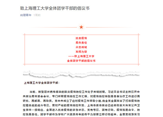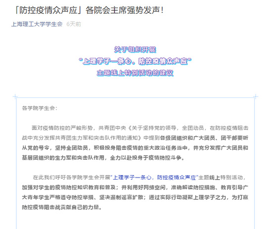 校会发起“上理学子一条心,防控疫情众声应”线上活动