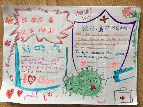 用彩色的笔勾勒图案、写上不同的语言……留校期间,她还特意制作了一幅生动的抗疫宣传海报,号召国际学生抗击病毒从自己做起,同时向白衣天使致敬,为中国加油。“学校已经开通了在线课程,这样的措施挺好的,我们可以在疫情之下坚持学习。” 柔姿谷说:“作为国际学生,这是我们在中国经历的一个非常特殊的时期,我们和所有中国人一样,一起为中国加油,贡献自己的点滴力量!只要我们再耐心一点,再等待一阵,春暖花开的时候,就是我们战胜疫情的时候!”
