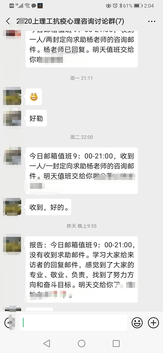 收到决定组建上海市级层面抗击疫情心理援助中心工作组的通知后,两位老师立马报名参加,并在第二天就开始学习大量资料,进行准备,随后在学校开通了上海高校面向社会开放的第五条抗击疫情心理支持热线。在这段时间里,每天都会有5到6个电话打进热线,热线咨询师们曾为压力大的基层工作人员排忧解难,也给担心学业进度受阻的同学们吃下“定心丸”……对于每一个电话,杨颎都要了解咨询情况、提出改进意见、总结经验。此外,杨颎与陈峰还承担着全国心理援助邮箱的邮件咨询服务。“我和陈峰老师都是党员,也是老搭档,当初在报名的时候,我们没有犹豫,可能就是源于心里的那份‘使命感’吧!我们知道什么时候能检验专业水平,什么时候要勇于承担社会责任,只要能够让大家振作起来,不管什么时候我们都愿意站出来!”杨颎说道。