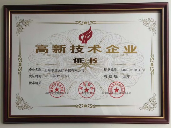 卓道医疗获“高新技术企业”证书