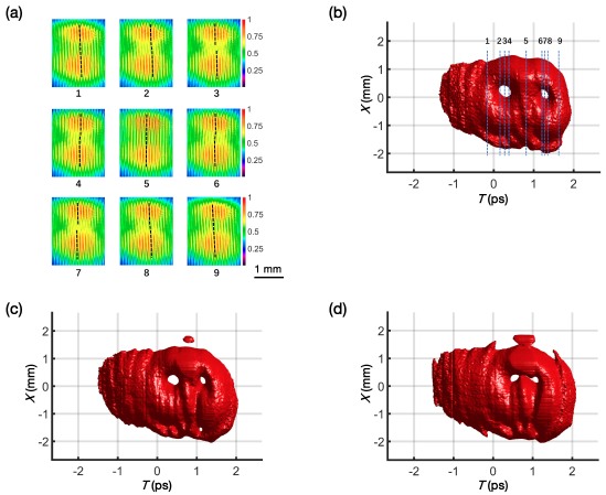 图1 携带时变轨道角动量的超快时空波包的产生。a)时空波包与参考脉冲的干涉图案;b)包含时间间距为1.00ps且拓扑荷分别为+1,-1的两个时空涡旋的时空波包;c)包含时间间距为0.74ps且拓扑荷分别为+1,-1的两个时空涡旋的时空波包;d)包含时间间距为0.51ps且拓扑荷分别为+1,-1的两个时空涡旋的时空波包。