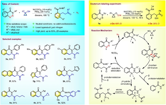 在本论文研究中,作者首次发现了一种廉价金属镍催化的苯并三嗪酮与取代环丙醇的脱氮偶联反应,并在此基础上开发了一系列官能化β-芳基酮的简便、高效合成方法。该方法在相关药物及中间体,例如HIV蛋白酶抑制剂、胃肠道药物、钾竞争性酸阻滞剂等合成中具有潜在应用价值。论文展示了25种新型邻位酰胺取代的β-芳基酮的合成,产率最高达93%。该反应无须外加酸碱及其它添加剂,氮气是唯一的副产品,因而具有较高的原子经济性。此外,作者还通过自由基捕获实验(free radical trapping)和同位素氘标记实验(deuterium labeling)对该反应机理进行了研究。
