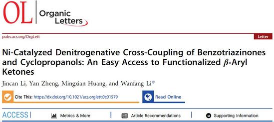 6月11日,我校理学院化学系2016级本科生李金灿在《有机化学通讯》(Organic Letters,IF= 6.55,SCI一区)在线发表研究论文“镍催化苯并三嗪酮和环丙醇的脱氮偶联反应: 一种简便合成官能化 β-芳基酮的方法”(Ni-Catalyzed Denitrogenative Cross-Coupling of Benzotriazinones and Cyclopropanols: An Easy Access to Functionalized β-Aryl Ketones)。《有机化学通讯》于1999年由美国化学会创办, 很快成为享誉有机化学专业领域的国际知名期刊。该期刊对论文研究结果的新颖性及重要性、方法的科学性及实用性、数据的准确性及完整性等方面有着较高要求。