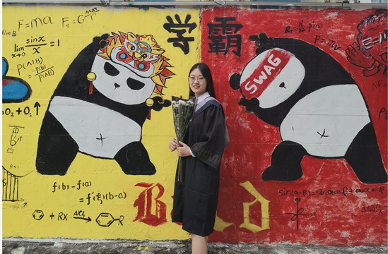 田慧在学校涂鸦墙前留影