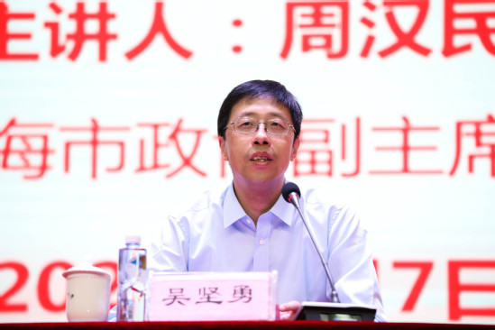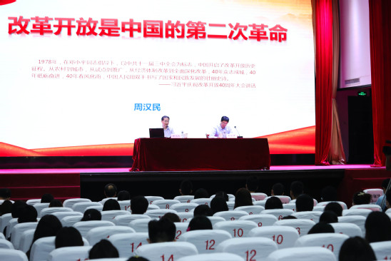 作为学校深入学习贯彻习近平总书记重要讲话精神,把“四史”学习教育与中心工作紧密结合的重要一环,9月7日上午,在学校与上海公共外交协会共建上海公共外交研究院签约仪式之后,全国政协常委、民建中央副主席、上海市政协副主席、民建上海市委主委、上海公共外交协会会长、上海公共外交研究院理事长、我校特聘教授周汉民应邀为学校两级中心组作“改革开放是中国的第二次革命”的专题报告。全体在校校领导、中层干部、辅导员、本研学生代表300余人参加报告会。报告会由党委书记吴坚勇主持。