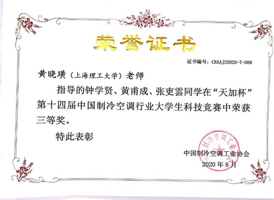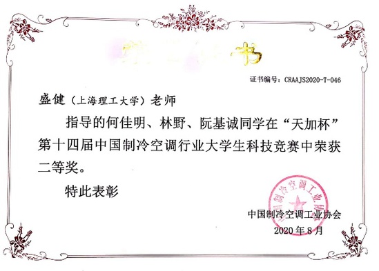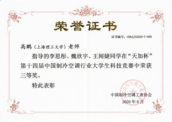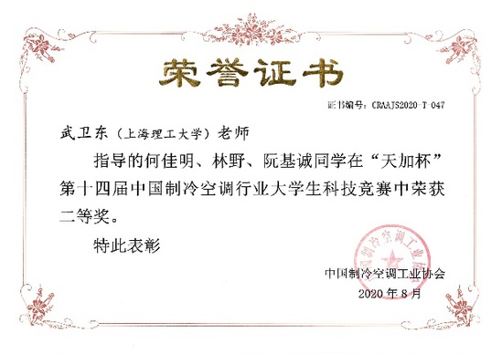 在武卫东、盛健两位老师指导下,何佳明、林野、阮基诚三位本科生同学完成的“恒温宝甲”项目荣获竞赛二等奖;在盛健、黄晓璜老师指导下,钟学贤、黄甫成、张吏雲三位本科生同学完成的“冷库排管除霜机器人”项目荣获竞赛三等奖;在高鹏老师指导下,李思彤、魏欣宇、王闻婕三位本科生同学完成的“一种新型高效的冷藏车制冷系统”项目荣获竞赛三等奖。此外,上海理工大学获颁赛事优秀组织奖。