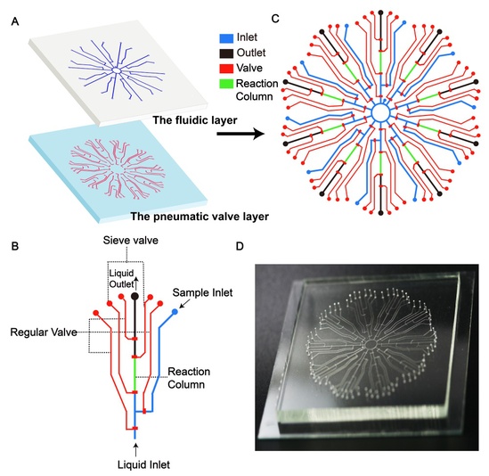 下图为研发的基于微流控技术的免疫检测芯片,该芯片包括管道层和阀门层,可以通过对阀门的控制实现检测过程的自动化操作,并且该芯片包含10个检测单元,可以对多个样品同时检测。该免疫检测芯片的研发,为牛奶中抗生素检测提供了一种灵敏、快速、简便的检测方法。