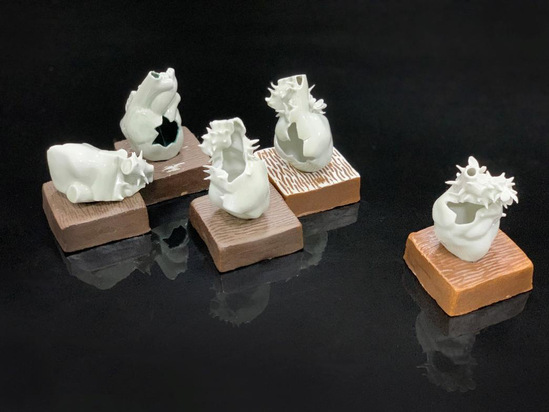 创意说明:用陶瓷材料创作的供石雕塑同样具备奇石清脆之声以及“皱、瘦、漏、透”等特点。