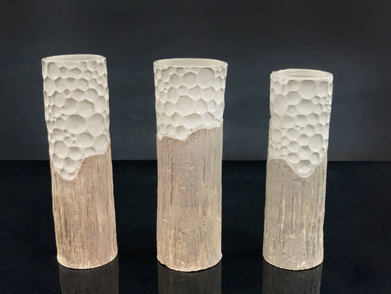 创意说明:用陶瓷表达树皮与凹面的质感,两者自然衔接,作瓶意在表达环境正在遭到破坏,生机在悄然中被腐蚀剥落,唤醒人们心中的环保意识。