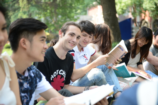 中外同学在校园里交流