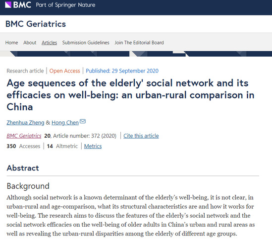 版艺学院环境设计系骨干教师郑振华,以第一作者身份在高水平学术期刊《BMC老年医学》(BMC Geriatrics,ISI-JCR检索SSCI一区,影响因子3.077)发表高水平学术论文“老年人社会网络的年龄序列及其对幸福感的影响:基于中国城乡比较”(Age sequences of the elderly’ social network and its efficacies on well-being: an urban-rural comparison in China)。该期刊是社会环境学、老年医学领域顶尖一区期刊。这也是郑振华以第一作者身份发表的第3篇SSCI一区(ISI-JCR检索)论文。