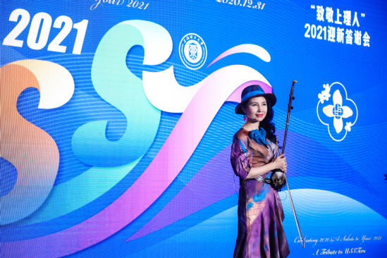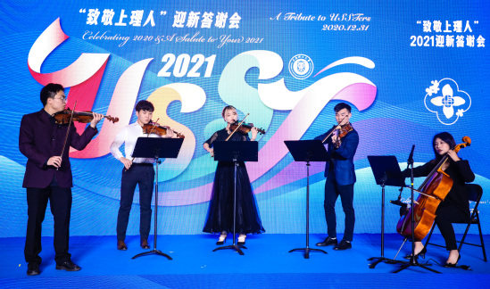 校党委书记吴坚勇与校长丁晓东早早地来到会场,欢迎师生代表,与每位师生代表亲切握手并合影留念,定格美好瞬间。由“沪江之声”教工合唱团深情演绎的《老师,我想对您说》拉开迎新答谢会的序幕,特邀著名二胡演奏家马晓晖、沪江管弦乐团等奏响《可爱的你》《万马奔腾》《四季-冬》,悠扬动人的琴声仿佛一座时光机,将人们的思绪拉回汗水与泪水交织、成长与抉择并存的2020年,令人感慨而动容。