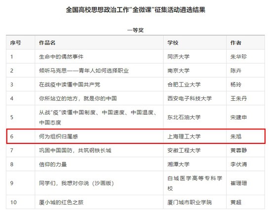 2月15日,由教育部思想政治工作司指导,高校思想政治工作队伍培训研修中心(高等教育出版社)、全国高校思想政治工作网、高校辅导员网络培训中心联合举办的2020年度全国高校思想政治工作“金微课”征集活动遴选结果正式公布。经作品征集、专家评审、结果公示等程序,我校医疗器械与食品学院辅导员朱旭老师的微课《何为组织归属感》获评一等奖,同时获得教学设计奖单项奖。