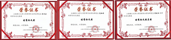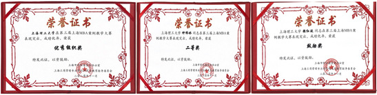 上海理工大学获第三届上海MBA案例教学大赛优秀组织奖,仲伟冰老师获二等奖、赖红波老师获鼓励奖,MBA学生邹学荣、高梅娟获2019年上海MBA优秀学位论文奖,蒋晓焰同学获优秀学位论文提名奖。