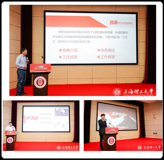 理学院副院长章国庆代表二级学院做了《着力开展理科创新竞赛 服务学校创新人才培养》报告,光电学院李阳代表优秀指导教师做了《团聚成火、散皆繁星》经验报告,机械学院李翔代表创新创业学生优秀团队做了《追梦赤子心》团队成长和竞赛经验分享。