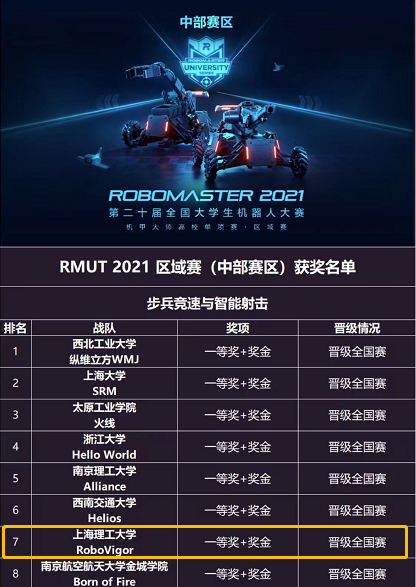 经过两天激烈的比赛,RoboMaster 2021中部区域赛RMUT高校单项赛近日落下帷幕,上海理工大学RoboVigor 机器人队凭借着“步兵机器人”的优异表现,在“步兵竞速与智能射击”项目中脱颖而出,获得一等奖并成功晋级全国总决赛。