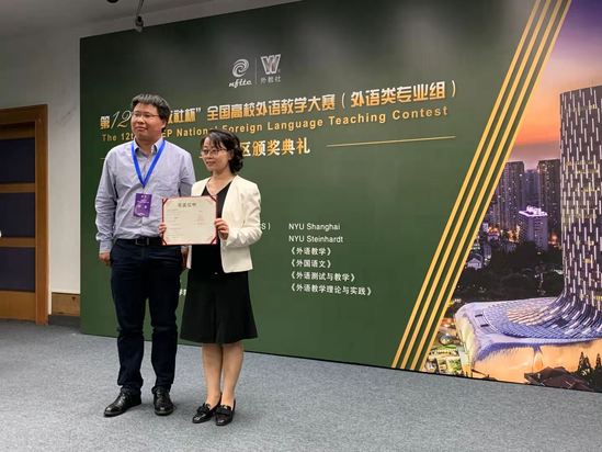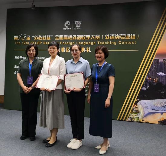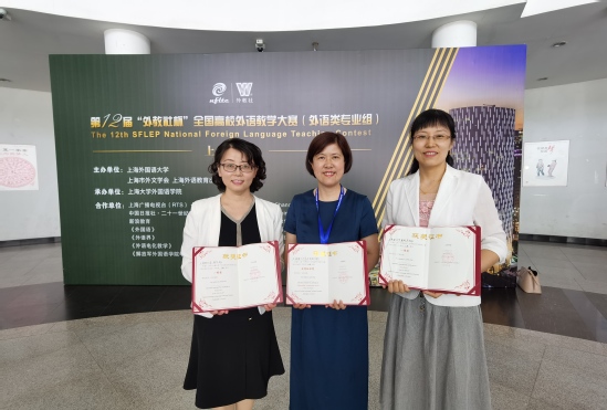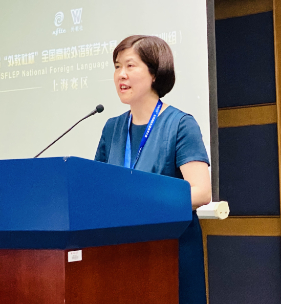 我校外语学院英语系(科技翻译)副主任贾晓庆和英语系(中美合作)主任黄芳全程参与了为期2天共3轮的激烈角逐,两位老师凭借扎实的语言功底、深厚的人文素养、丰富的教学经验和独到的分析视角赢得了评委老师赞赏,尤其在课程思政与外语教学融合部分,充分展现了价值观塑造与知识传授、能力培养的有机融合,最终分别获上海赛区总决赛英语专业组一等奖和商务英语专业组一等奖,展示出了我校英语专业教师精进的职业素养、流利的语言能力、较强的思辨能力以及对课程思政的深刻认识。外语学院获本次大赛中唯一的优秀组织奖。教育部高等学校大学外语教学指导委员会委员、我校外语学院院长刘芹教授担任赛事的评委会主任,并在颁奖典礼上代表评委会进行兼具高度、深度和广度,内容丰富且言语幽默的点评。
